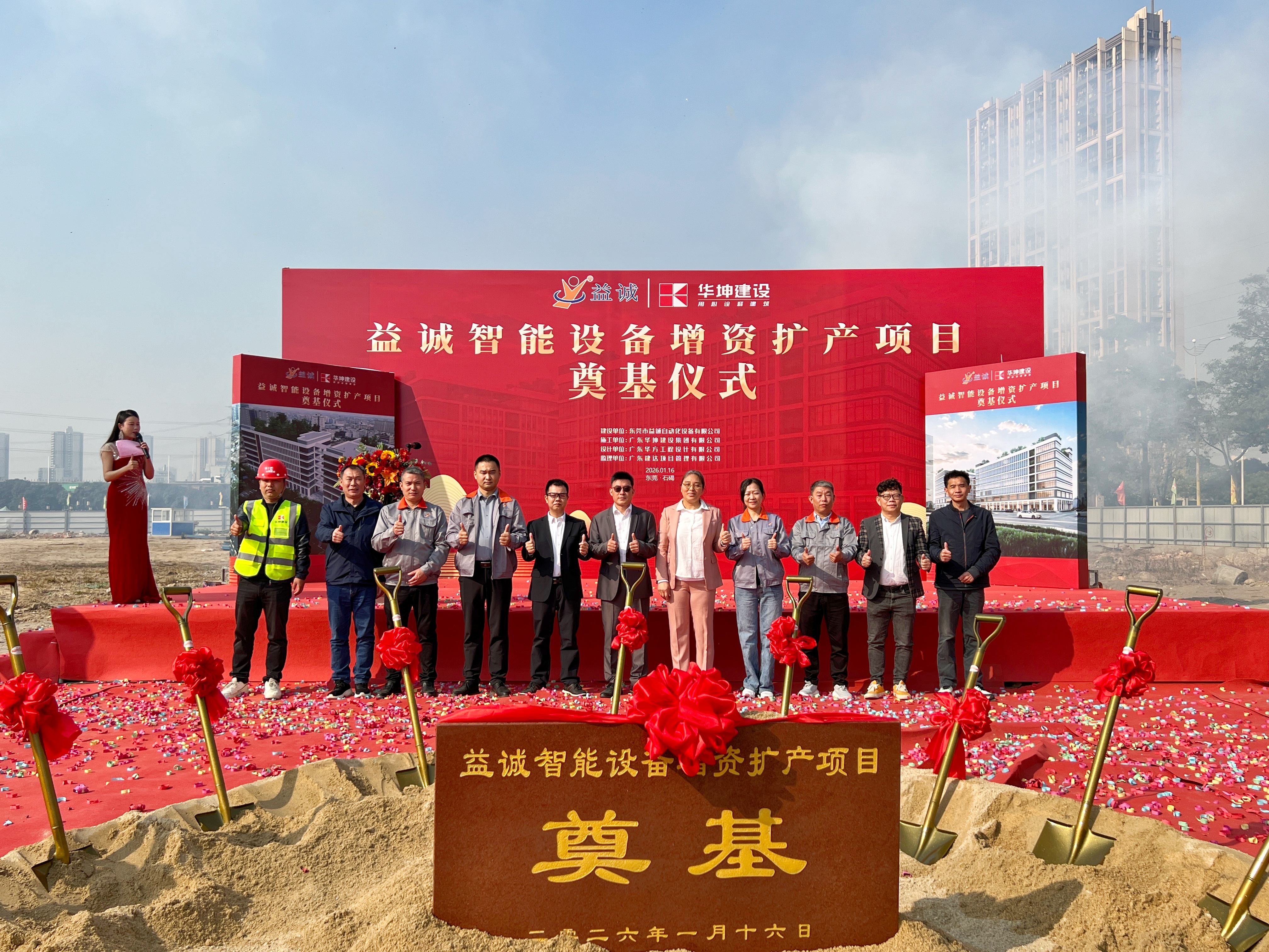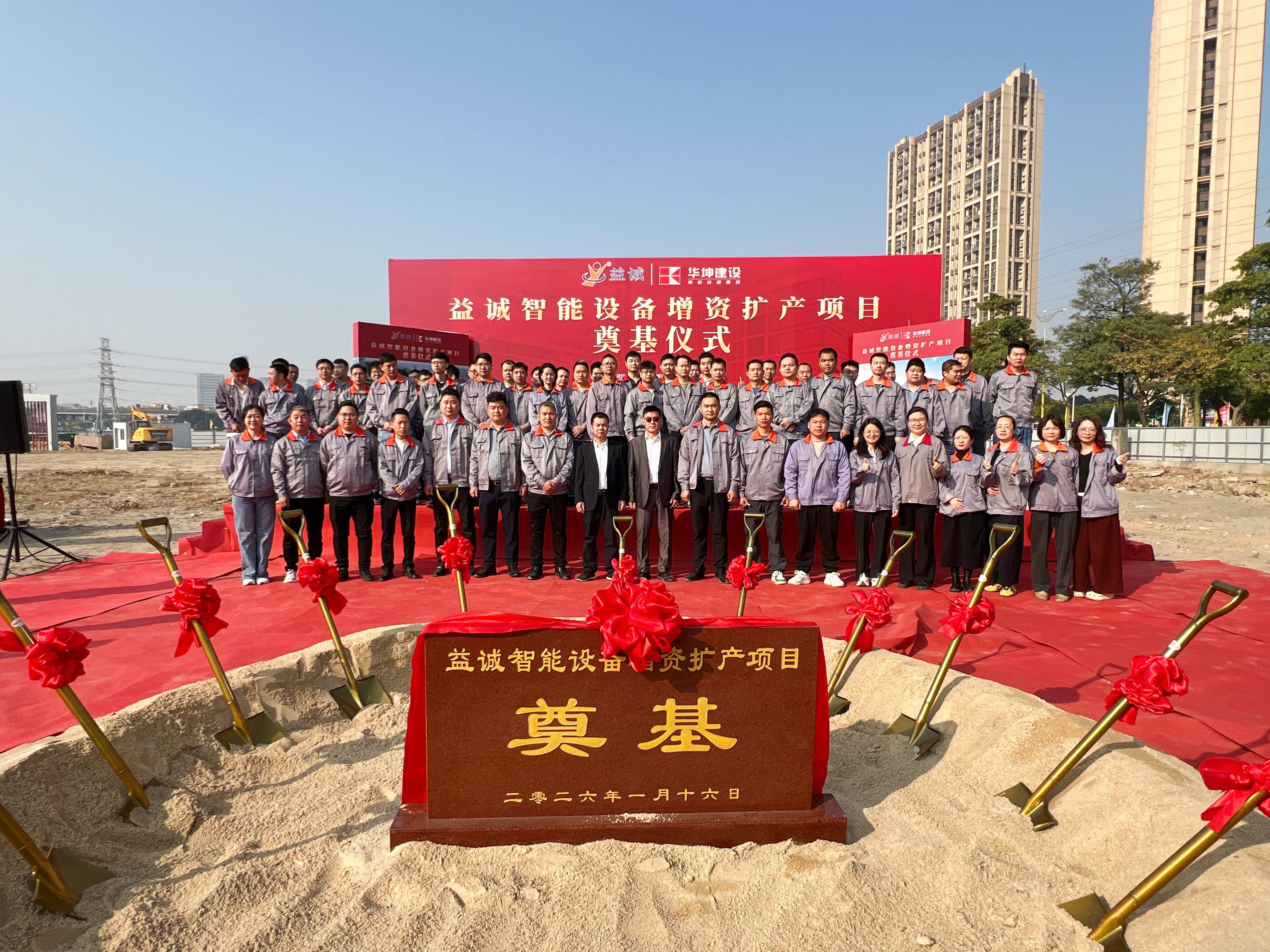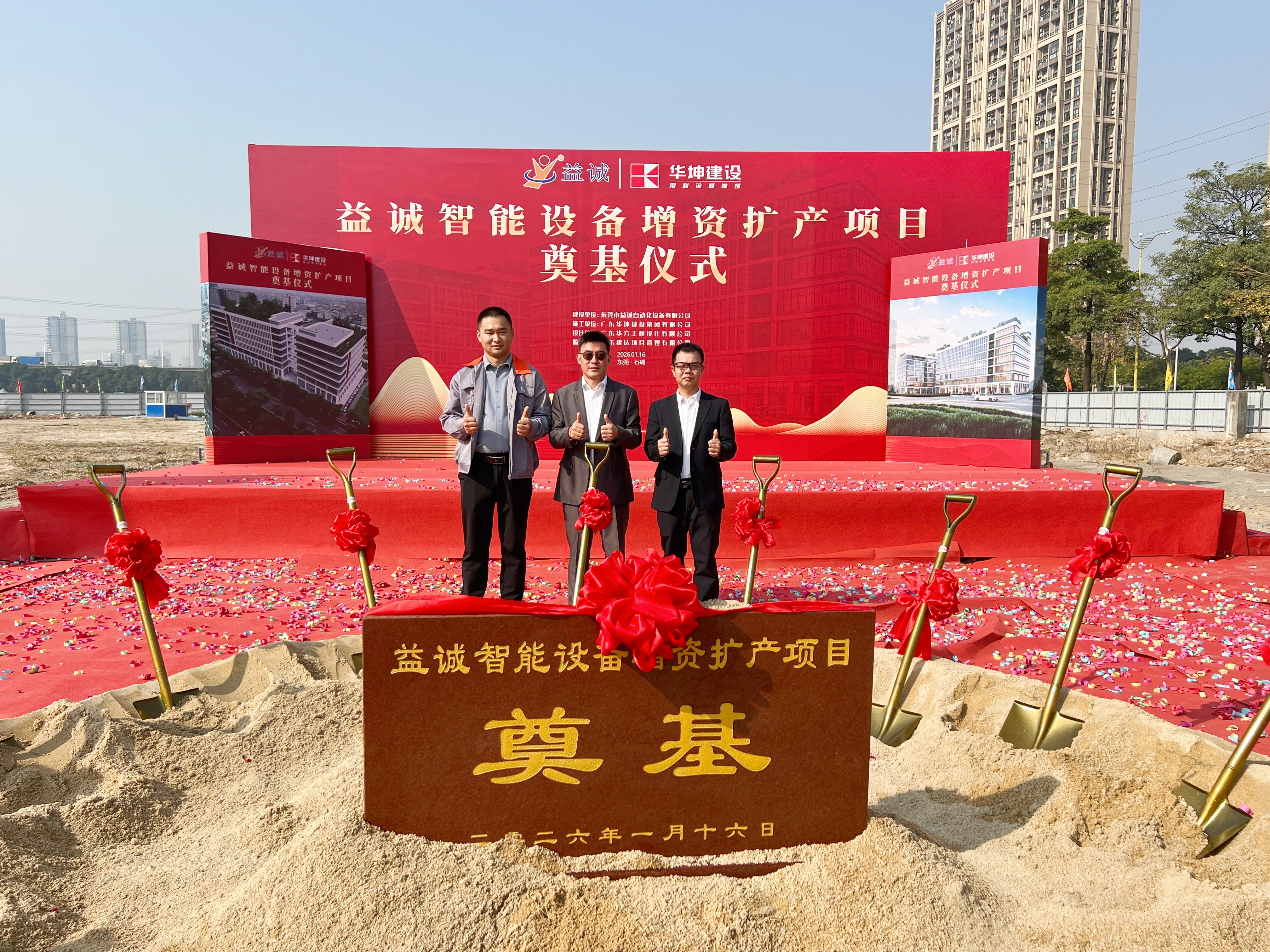 2026年1月16日,艷陽高照,晴空萬里。在這充滿希望與激情的季節(jié),益誠智能設(shè)備增資擴(kuò)產(chǎn)項目奠基儀式隆重舉行。益誠自動化董事長袁董、總經(jīng)理潘總攜眾高管與本項目的設(shè)計方、施工方、監(jiān)理方等參建單位代表齊聚一堂,共同見證這一具有里程碑意義的盛典,現(xiàn)場氣氛熱烈非凡。